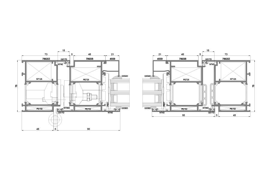 Nejmodernější tříkomorový tepelně izolační systém určený pro zhotovování dveřních konstrukcí s přerušeným tepelným mostem vykazuje díky 34 mm vložce a dodatečné izolaci vynikající tepelně izolační vlastnosti. Konstrukční hloubka rámu a křídla 78mm zaručuje výbornou stabilitu a tuhost profilu. Dveře vyrobené z těchto profilů se vyznačují vyspělou konstrukcí a patří k tomu nejlepšímu na trhu.